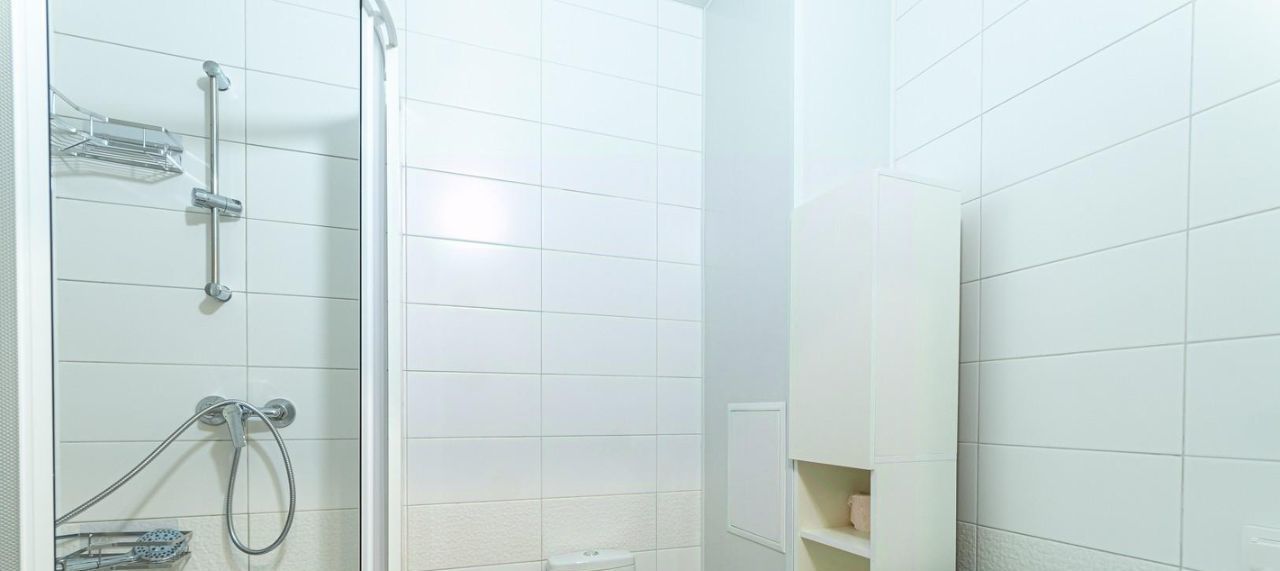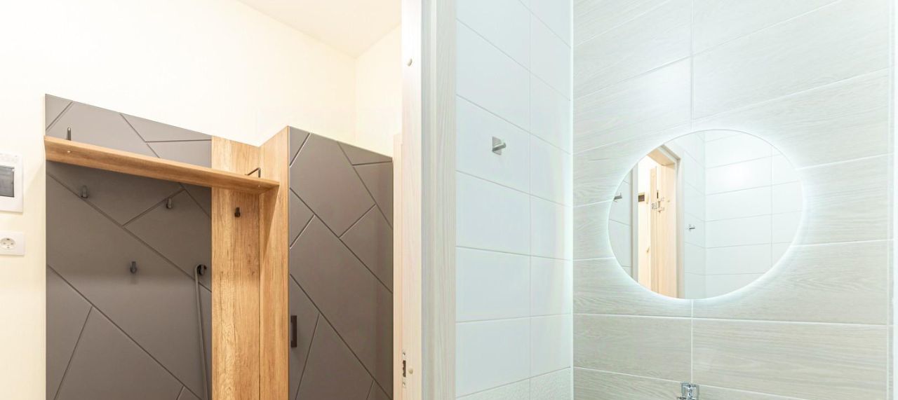 Ванная комната выполнена в кафельной плитке, душевая кабина. Зеркало с подсветкой находится над раковиной. Стиральная машина установлена там же.
