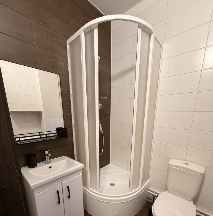 В ванной - душевая кабина, тумбочка, зеркало, стиральная машина.