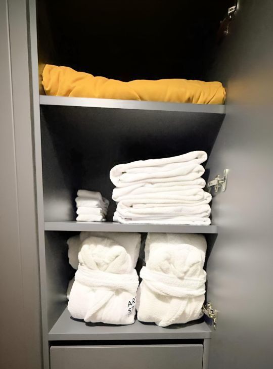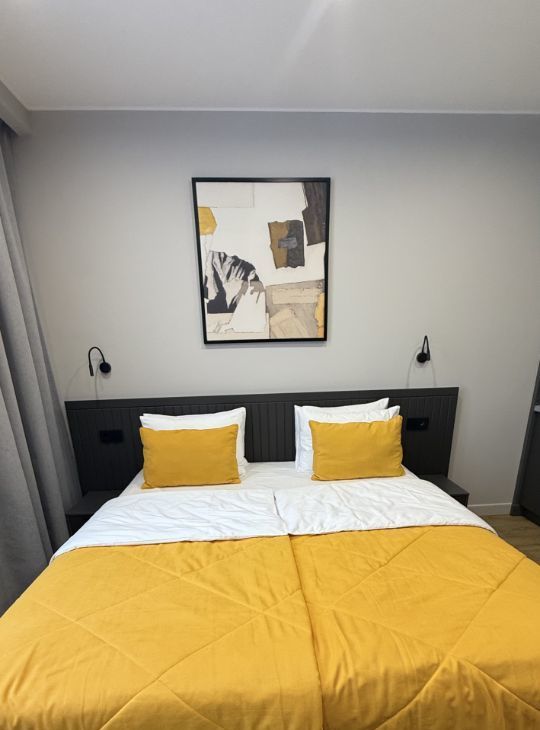 Комфортабельный номер с мини-кухней, где есть плита, микроволновая печь, холодильник, чайник посуда и столовые приборы, утюг, гладильная доска, сушилка для белья, халат, полотенца, фен, сейф.