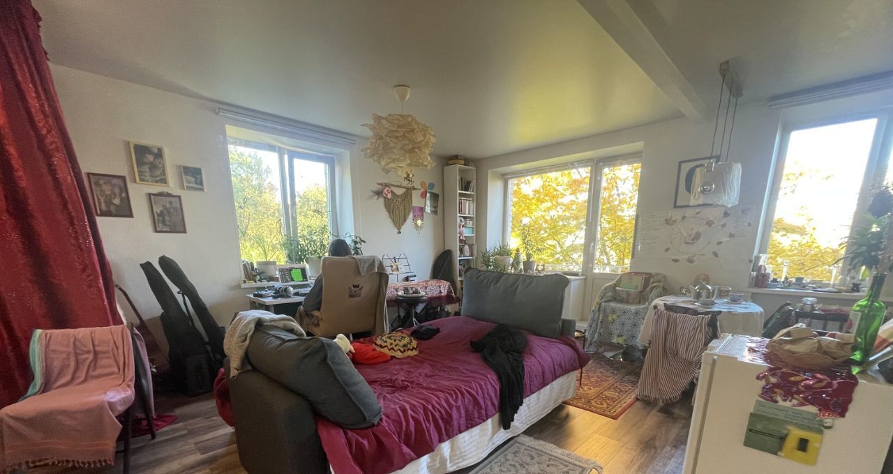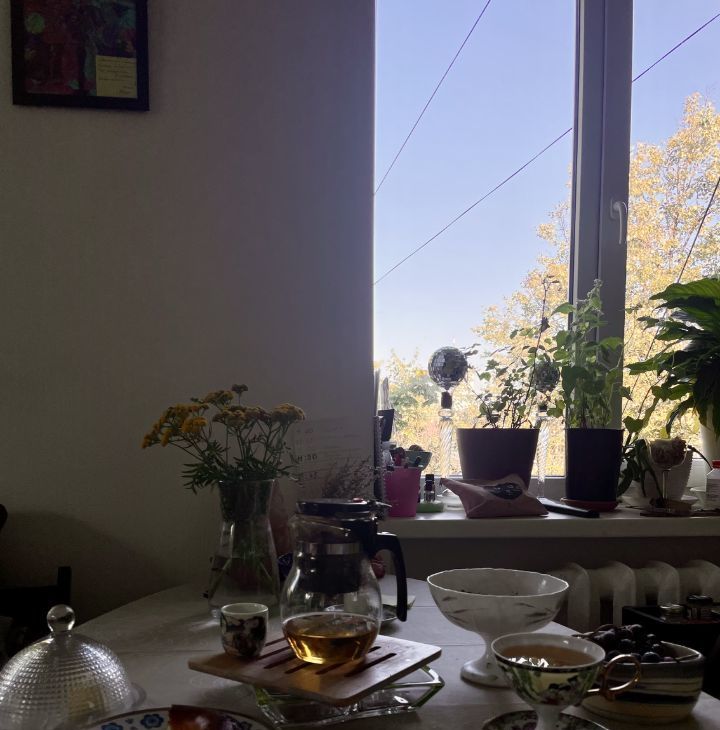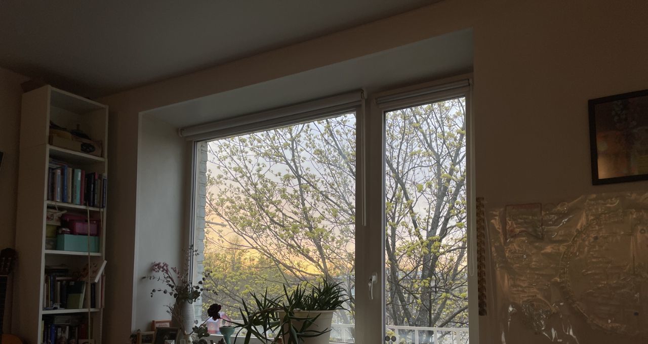 Три окна с видом на деревья создают простор, а в зелёное время года уединение и великолепные виды на закаты. Шикарный клён заглядывая на балкон радует золотом в осенний период. Синички любят прилетать на балкон подкормиться зимой.