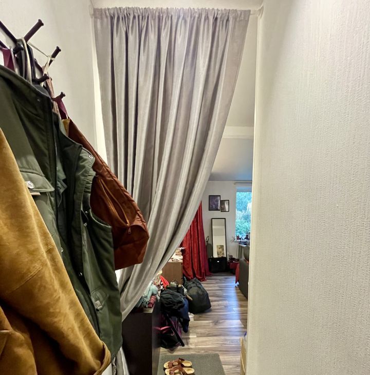 В комнате и на кухне есть мебель: диван-кровать, комод, гардеробная с рейлом для одежды и полками, обувной комод, большое зеркало, рабочий стол с удобным креслом и видом в зеленый двор, книжный шкаф, кухонный стол и стулья, шторы блэкаут для комфортного проживания в период белых ночей.