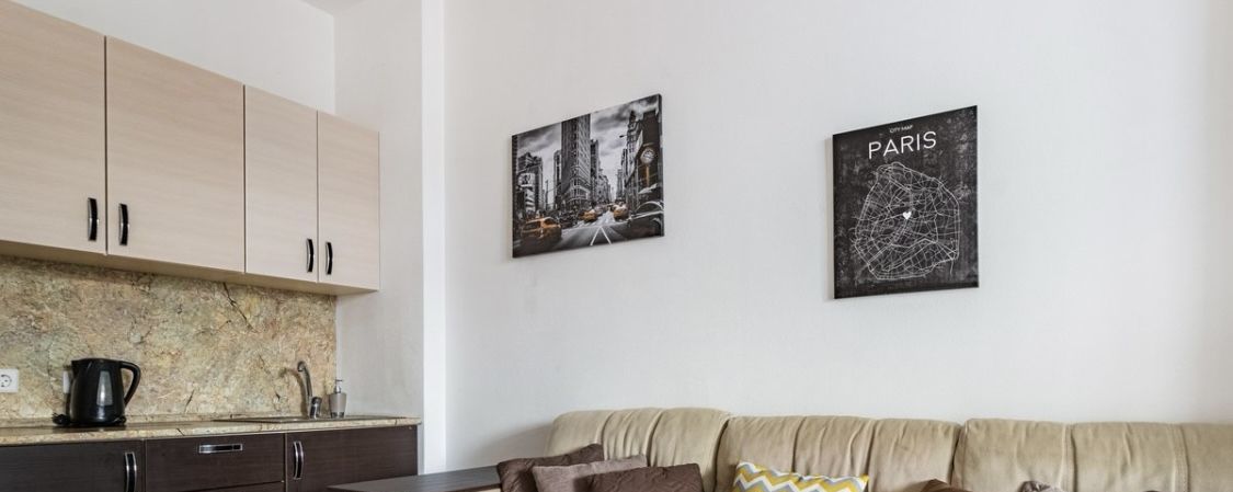 Кухонный гарнитур, плита, холодильник, свч, посуда, обеденный стол и кресла, двуспальная кровать и двуспальный диван, оборудованная для отдыха креслами и столиком лоджия, вместительный шкаф, шкаф пенал, стиральная машина - есть абсолютно все для того, чтобы ваше проживание было комфортным.