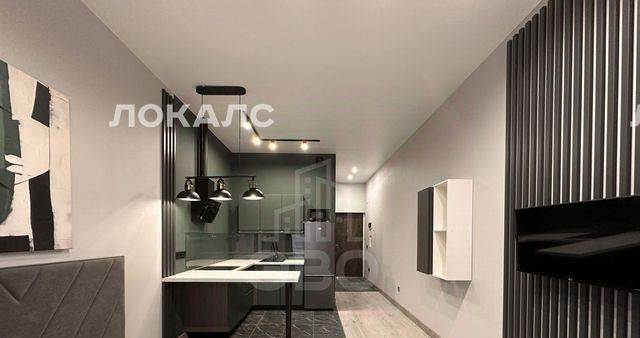 обеденный барный стол (барные стулья в ближайшее время привезут), кухонный гарнитур, гардеробная у входной зоны.