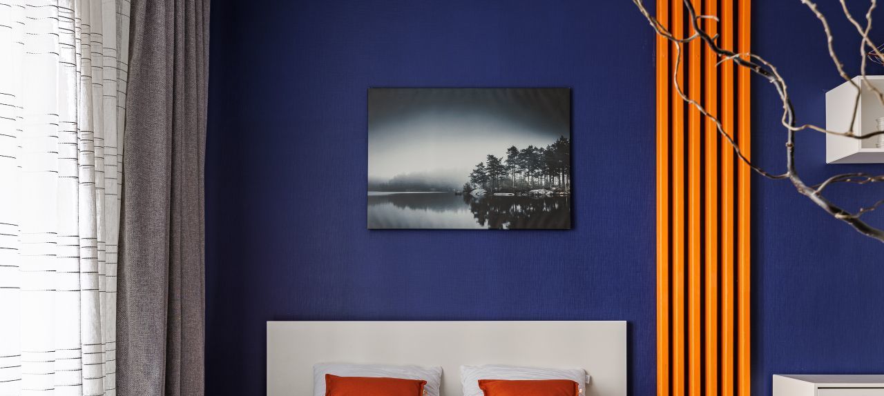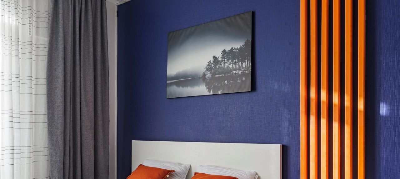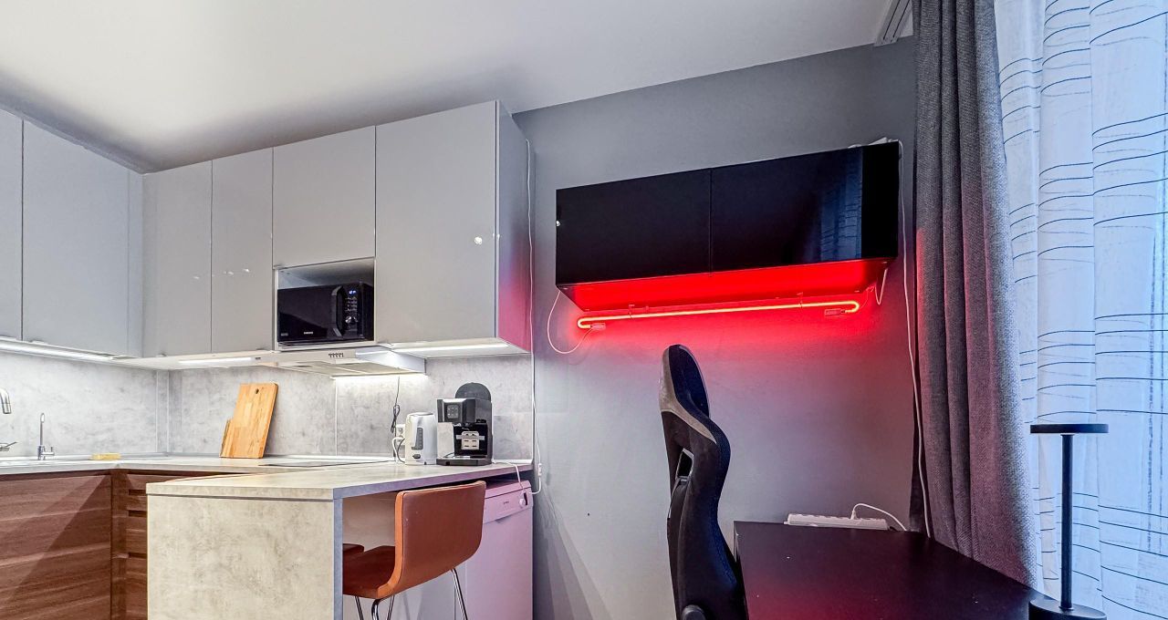 В квартире предусмотрены разные сценарии освещения: основной свет от люстры с потолка, подсветка с кухонного гарнитура, свет от настольной лампы, led подсветка вдоль синей стены с кроватью(управляется с пульта), а так же красный неон (трубка расположена около рабочего стола).