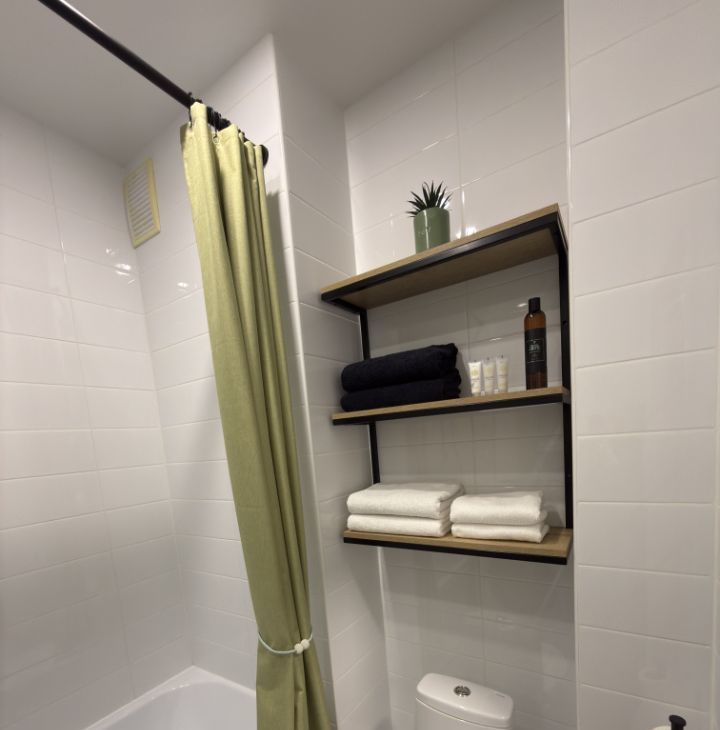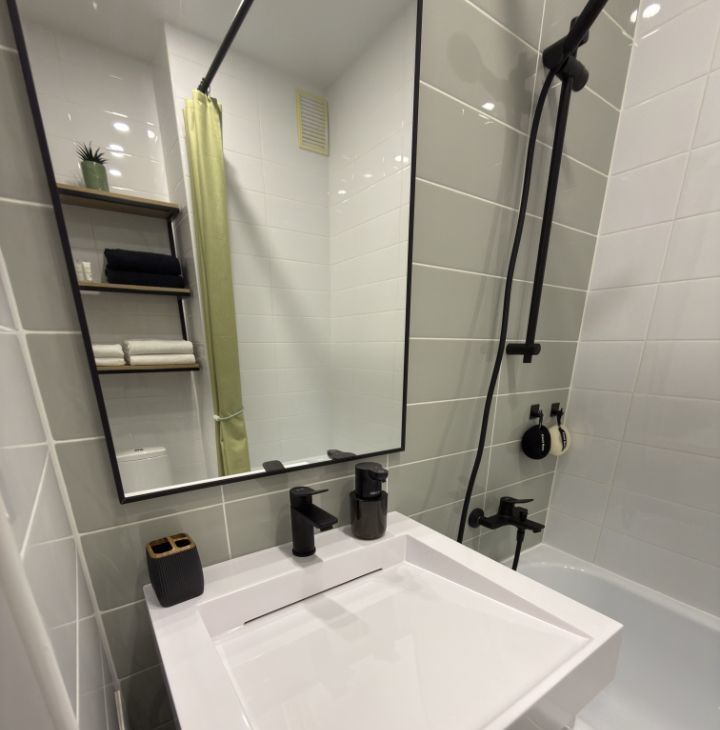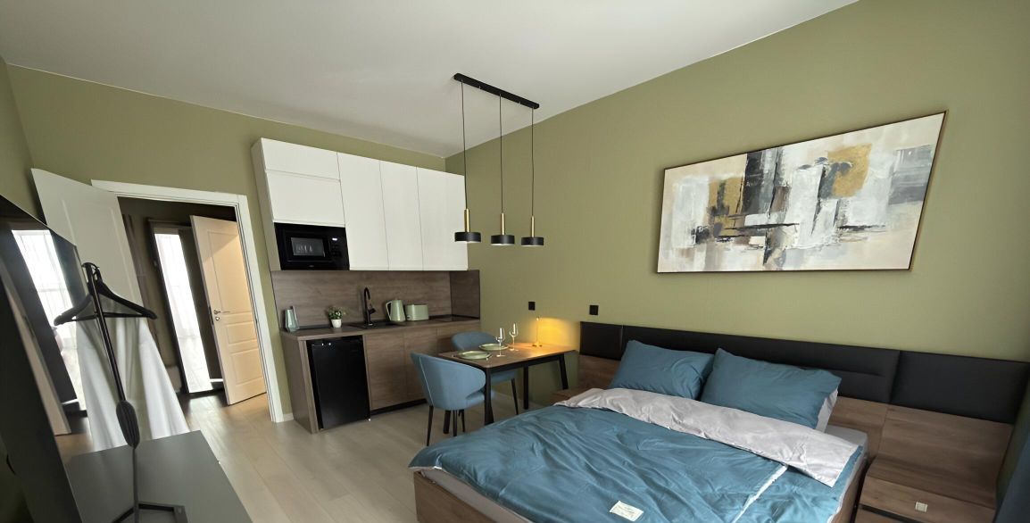 Жилье оснащено современной сантехникой и отделкой. Санузел совмещенный, выполнен в светлых тонах. В комнате просторная кровать и комод для хранения вещей.