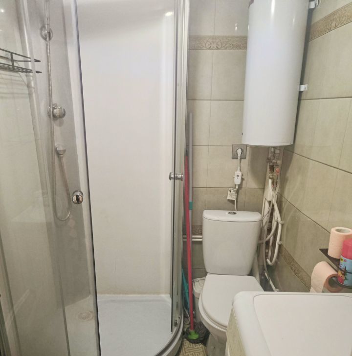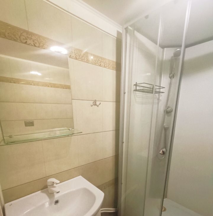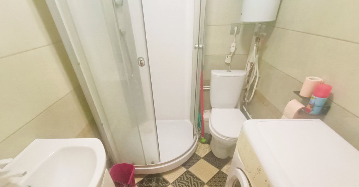 Санузел совмещенный, оснащен душевой кабиной и современной сантехникой. В прихожей предусмотрены удобные полки для хранения вещей.