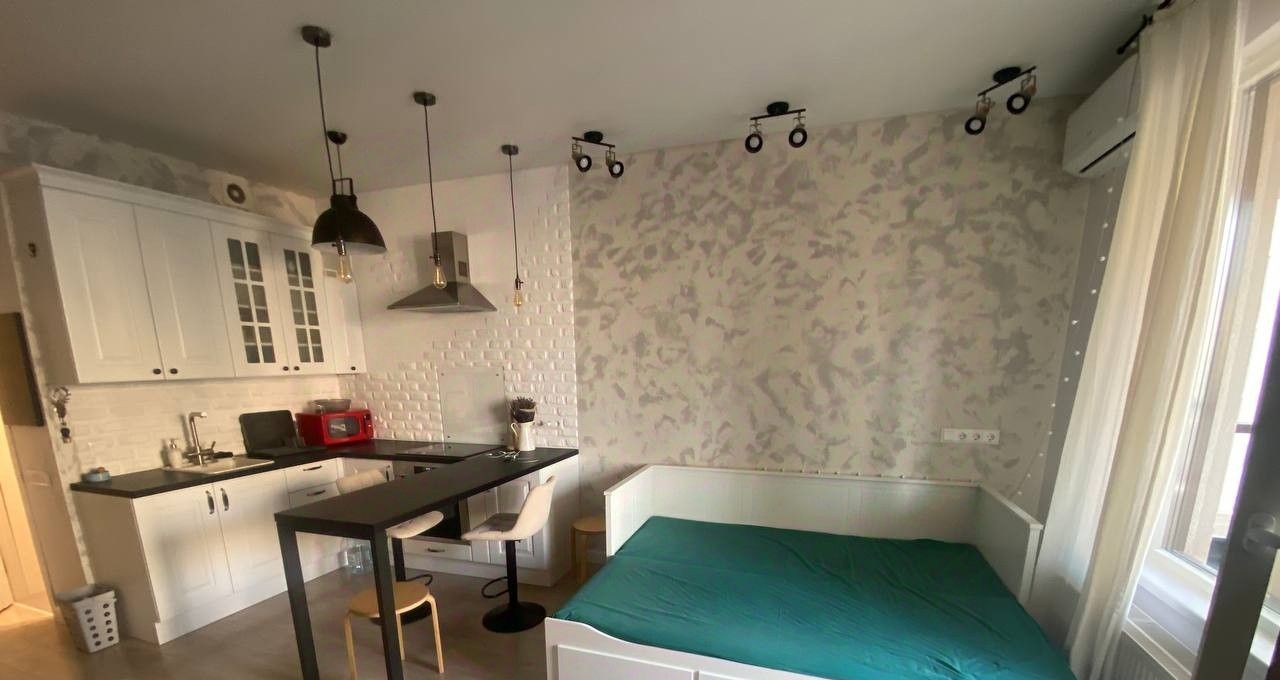 Студия на 12 этаже с выходом на тихий двор, кондиционер, ванная. Ремонт сделан в 2019 году