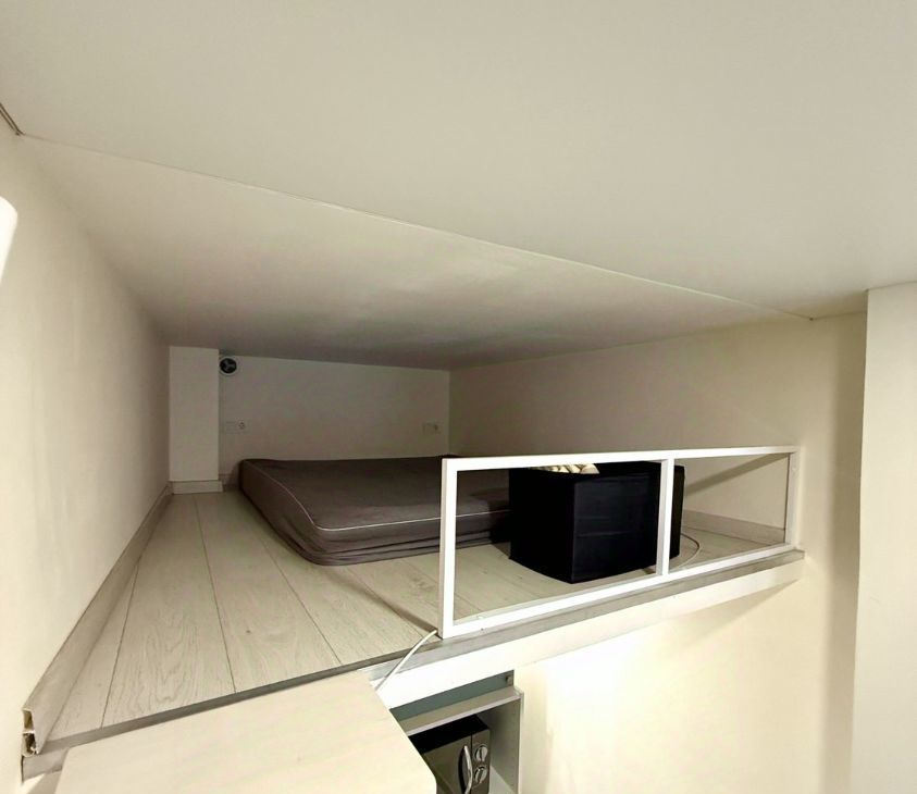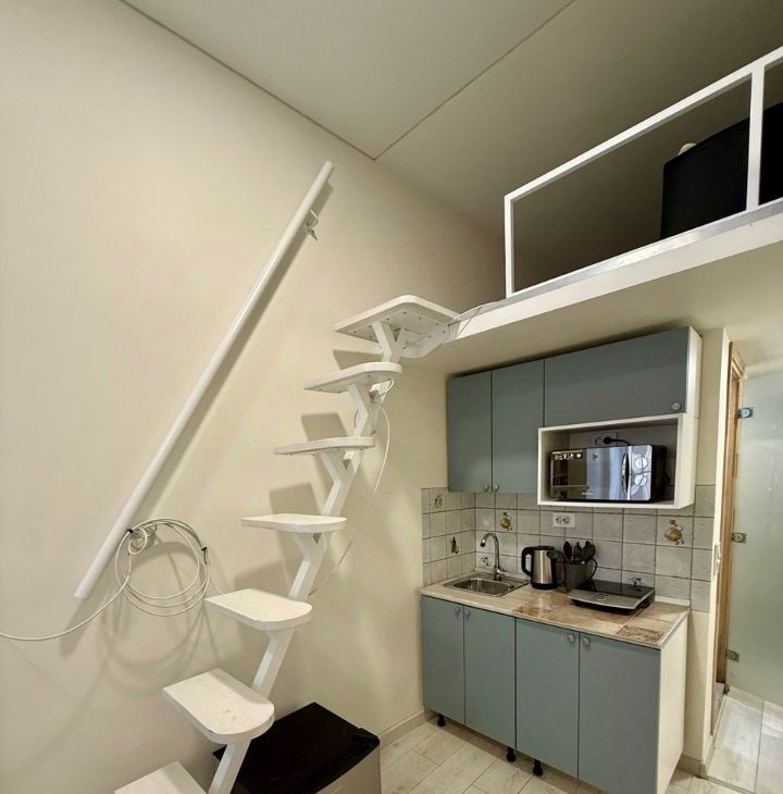 Студия двухуровневая: на втором уровне — спальное место, на первом — диван для отдыха.