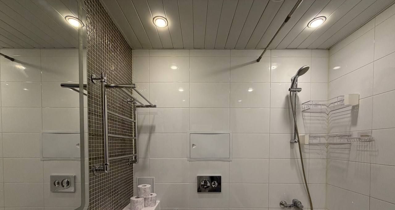 - Кухня со встроенной техникой: индукционной варочной панелью, посудомоечной машиной, вытяжкой, холодильником, электрическим чайником, посудой для приготовления и сервировки.