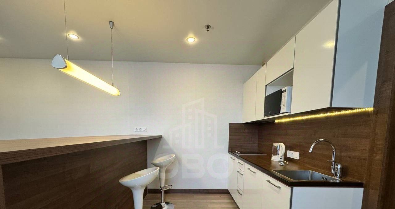 • Кухонная зона со встроенной техникой: варочная панель с вытяжкой, холодильник, микроволновка, чайник, стиральная машина