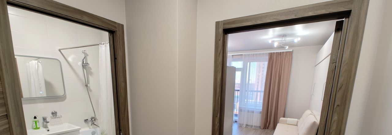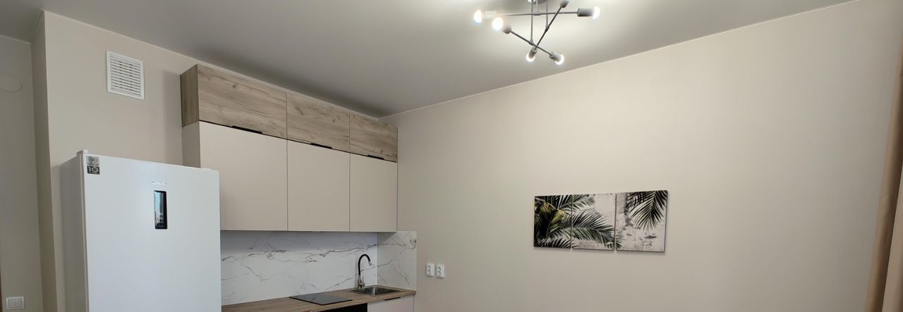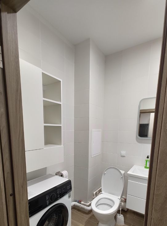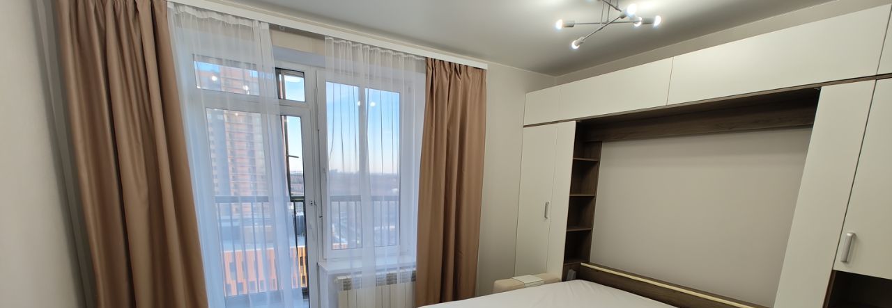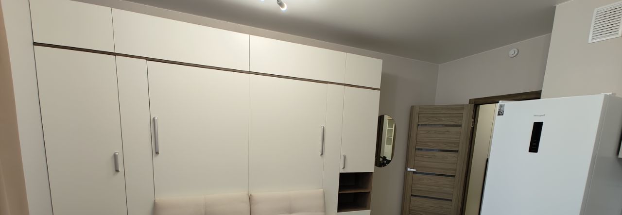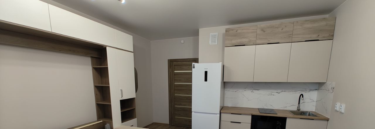Квартира полностью готова к заселению. Установлена вся необходимая техника: холодильник, стиральная машина, плита, вытяжка, микроволновка. В комнате есть кровать-трансформер, которая при складывании превращается в диван. Санузел совмещенный, с ванной. Есть лоджия, где можно наслаждаться свежим воздухом и видом на Лахта Центр.