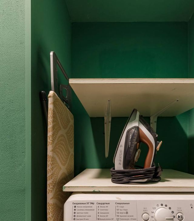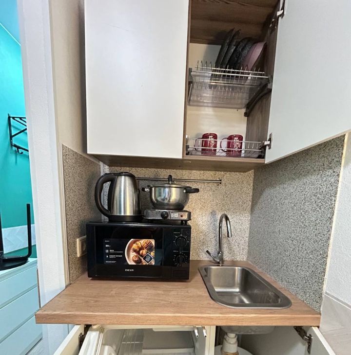 Двуспальная кровать, комод, (шкафа нет), телевизор, СВЧ, чайник, холодильник, стиральная машина, вай-фай.
