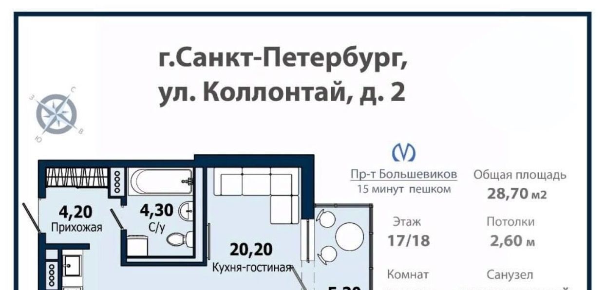 Студия Санкт-Петербург ул. Коллонтай, 2 (28.7 м²)