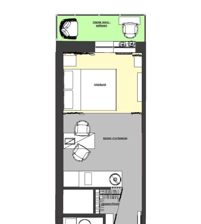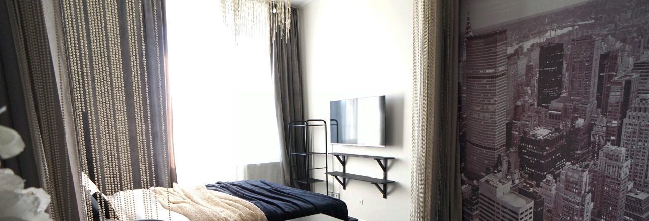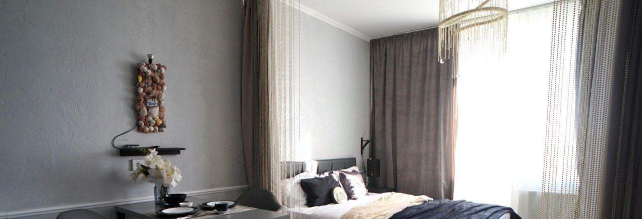 Пространство зонируется с помощью штор .Стильная кровать с комфортным ортопедическим матрасом Аскона независимые пружины 160-200 .оборудована подъёмным механизмом с местом для хранения.