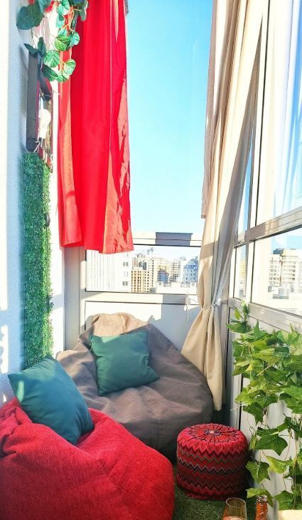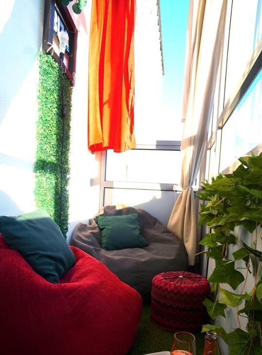 Просторный застеклённый балкон с зоной челаут и креслами бинбэг идеально для вечерних посиделок