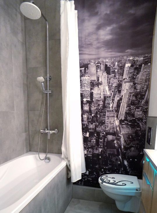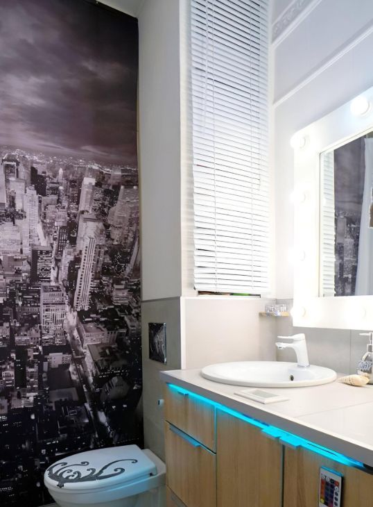 Ванная с панорамой Манхетона как и в гостиной .мебель с регулируемой подсветкой под настроение . тропический душ подвесной унитаз ,итальянские смесители , гигиенический душ стильное гримерное зеркало для селфи .