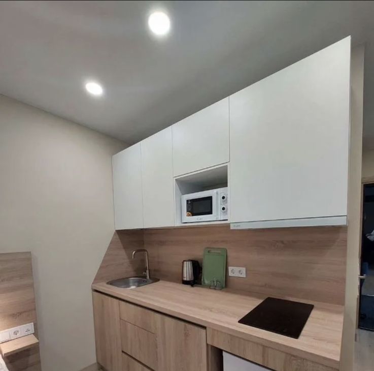 - кухня с встроенной техникой (варочная поверхность, микроволновая печь, вытяжка, холодильник) и предметами посуды