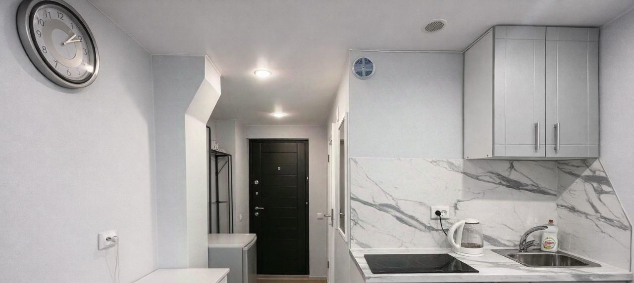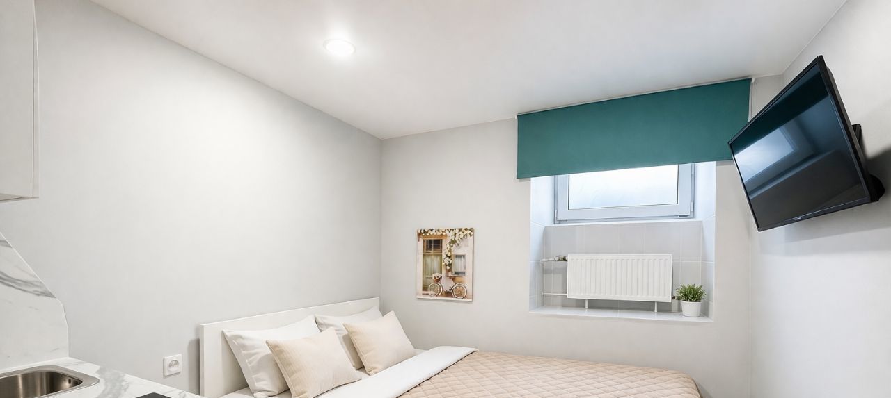 Студия только что прошла косметический ремонт — светлые стены, тёплые нейтральные оттенки, современный минимализм. В зоне отдыха — аккуратно заправленная двуспальная кровать с мягкими подушками, телевизор и небольшая зона хранения. Кухня оснащена всеми необходимыми бытовыми приборами: варочная панель, микроволновая печь, холодильник и стиральная машина. Санузел чистый и свежий, плитка белого цвета, душевое ограждение. Всё продумано для комфорта одного жильца или пары. Интернет уже подключён. Проживание с воспитанной кошкой обсуждается.
