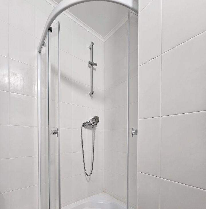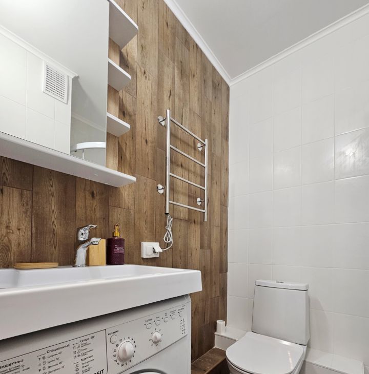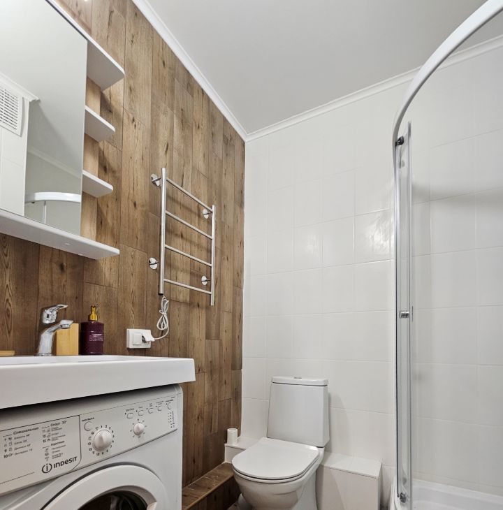 Санузел совмещенный, в кафеле. Душевая кабина, стиральная машина. Зеркальный шкафчик скоро будет установлен.