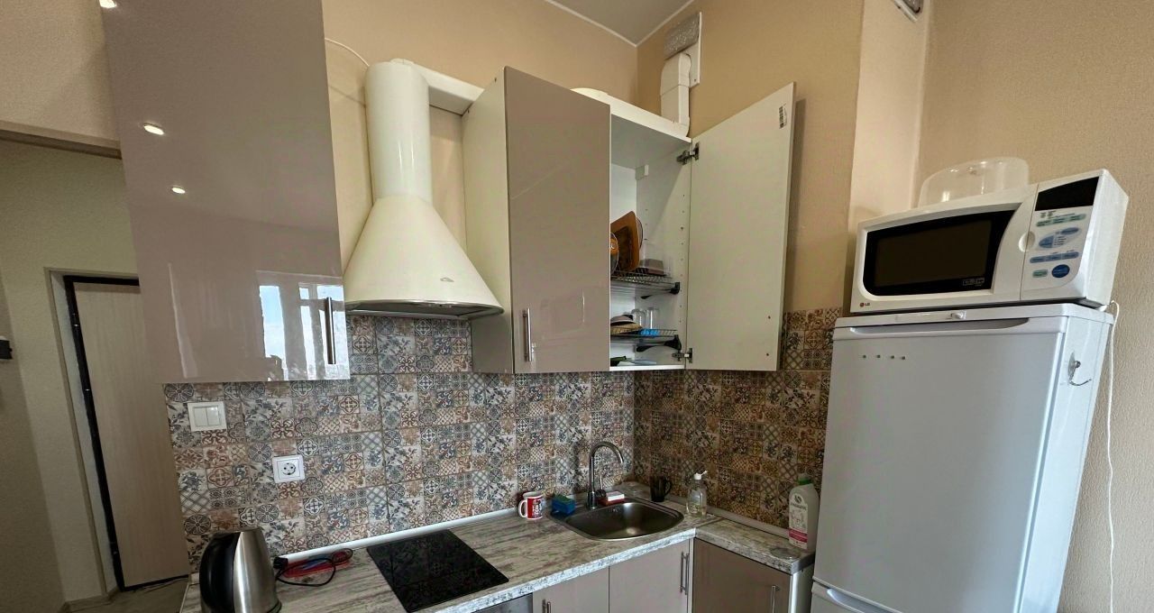 В квартире выполнен косметический ремонт, благодаря чему она выглядит стильно и современно. Пространство студии грамотно организовано: в комнате есть необходимая мебель, а также вся необходимая техника, включая холодильник и стиральную машину. Санузел совмещенный, в нем установлена душевая кабина. Высокие потолки (2.75 метра) и окна, выходящие на улицу, создают ощущение простора и света.