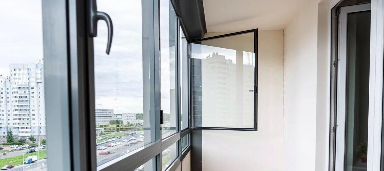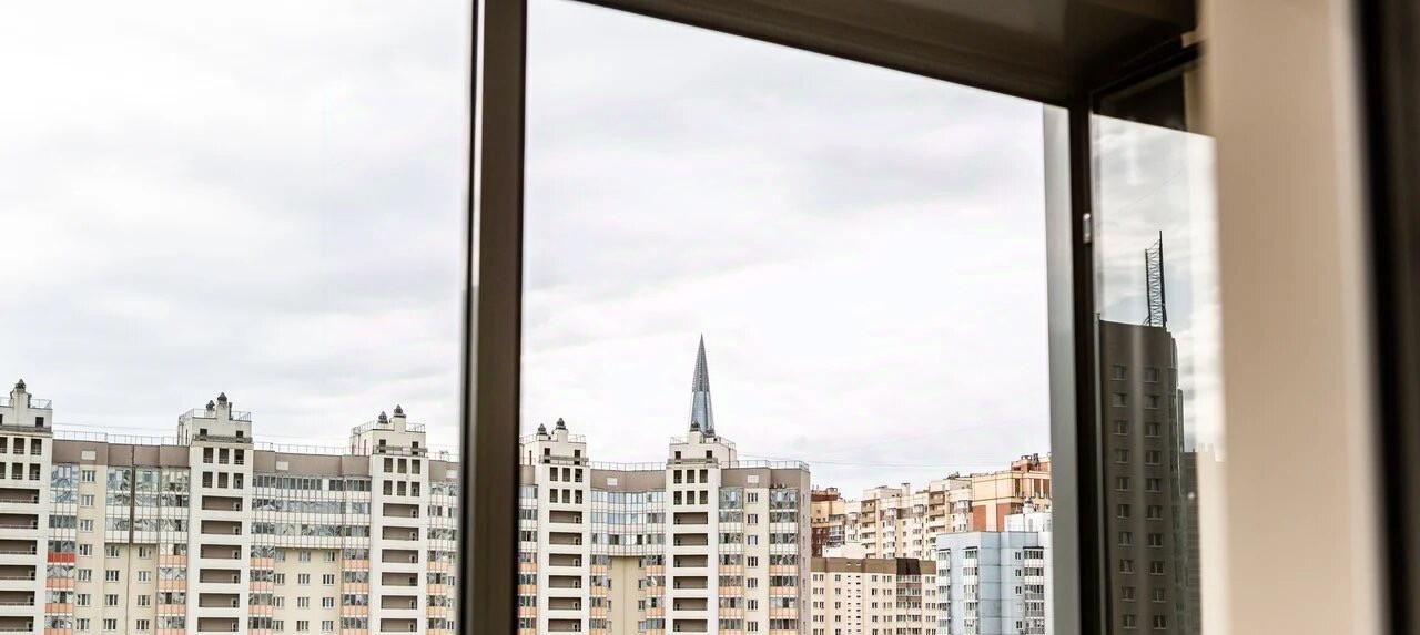 Большая застекленная лоджия с видом на Юнтоловский заказник и на шпиль небоскреба Лахта-центра.
