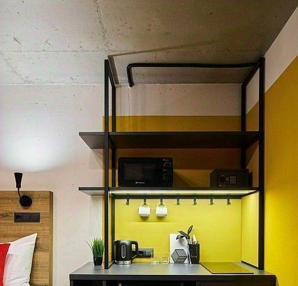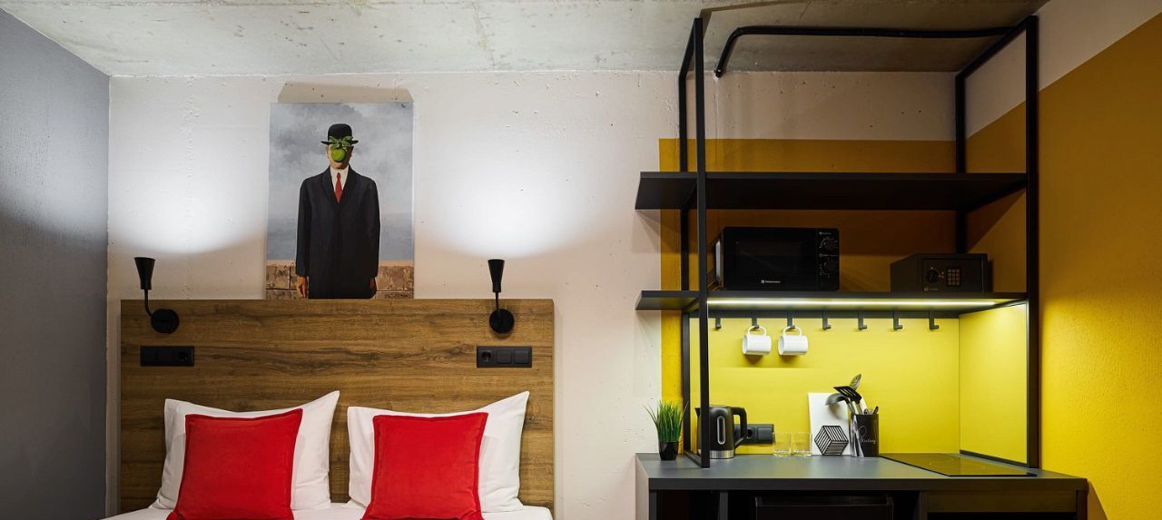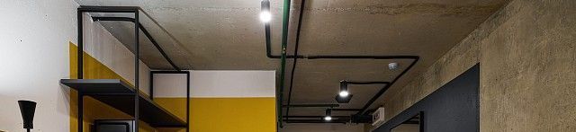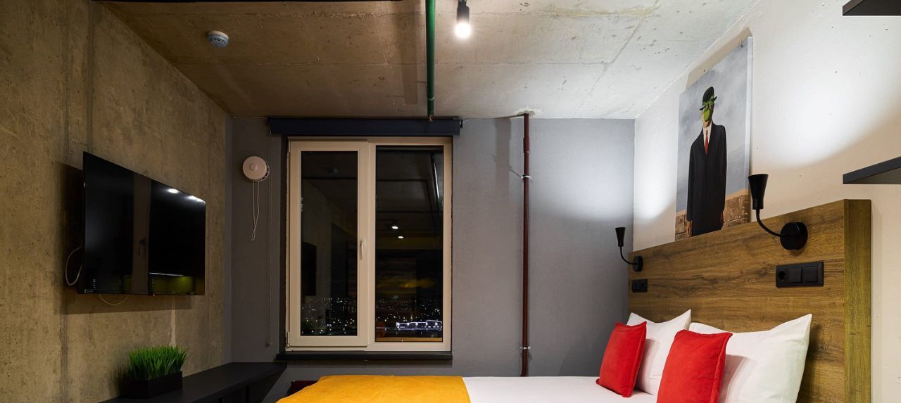 Внизу уютное лобби с круглосуточным баром и зоной коворкинга.