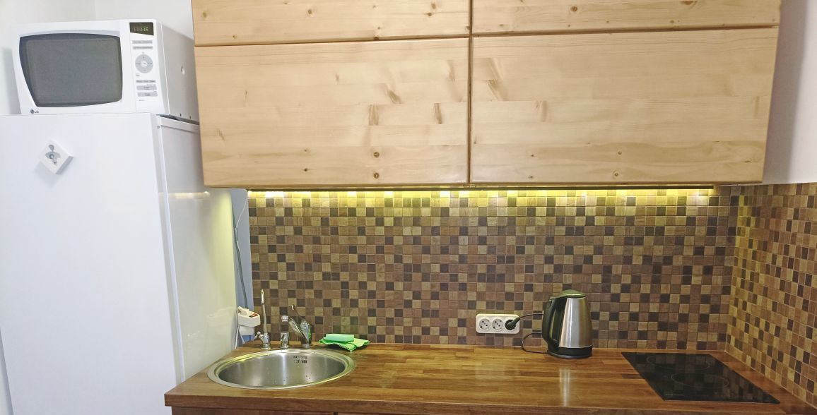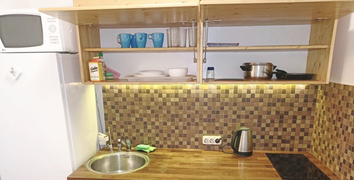 ТВ,Вай-фай,стиральная машина, холодильник, микроволновая печь, трёх ступенчатый фильтр проточной воды Барьер, необходимая посуда,фен, утюг, сушилка для белья, гладильная доска, система хранения, пылесос, электрочайник, электрическая варочная панель, духовой шкаф, чистое бельё и полотенца, моющие средства.