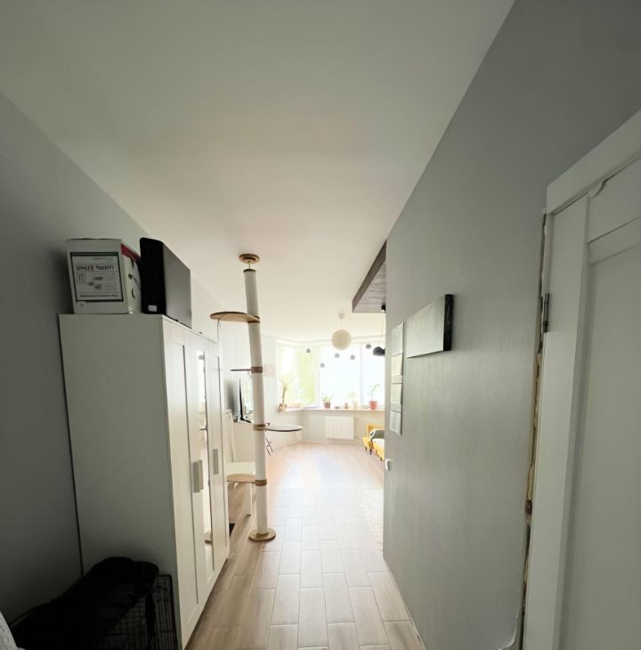 В квартире установлена качественная входная дверь, сделано зонирование кухни и прихожей материалами пола и потолка. Сначала керамогранит, потом в кухне стильная плитка, а в зоне комнаты хороший ламинат.