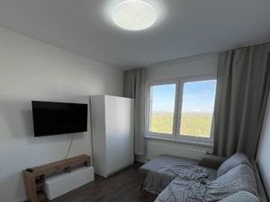 В квартире есть все условия, чтобы заехать и жить без хлопот: двухкамерный холодильник, варочная панель и вытяжка (незаменимая вещь для студии), угловой кухонный гарнитур с большим количеством мест для хранения и большой мойкой, вся необходимая посуда, обеденный стол и 2 стула, двухспальная кровать с постельными принадлежностями, вместительный шкаф, комод, стиральная машина и телевизор.
