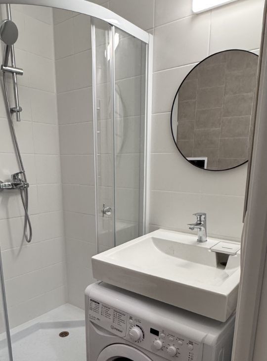 • Удобный диван-кровать • Стильная полка под телевизор •Обеденный стол и 2 стула • Кухонный гарнитур с плитой • Холодильник, микроволновка, чайник •Большой вместительный шкаф • Новая сантехника •Стиральная машина • Шторы блэкаут, тюль