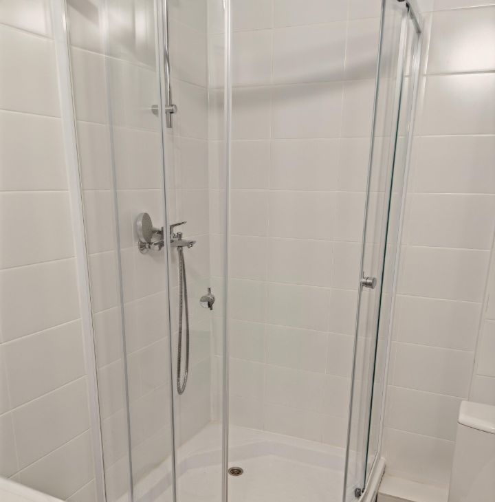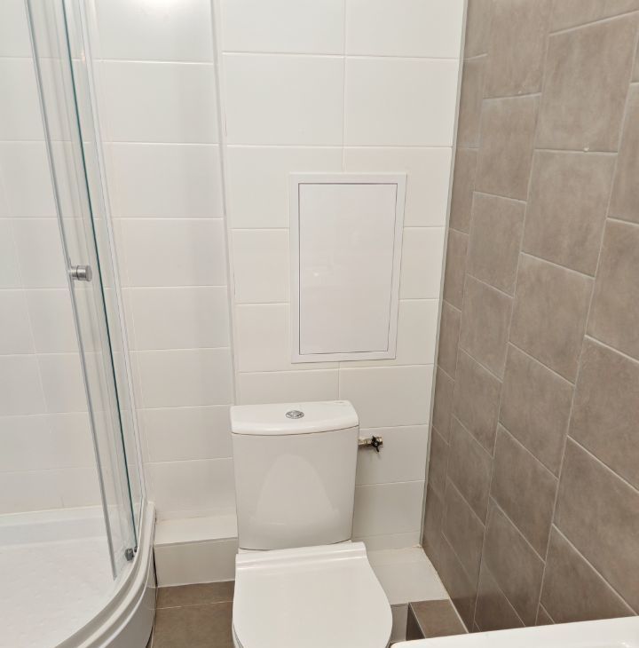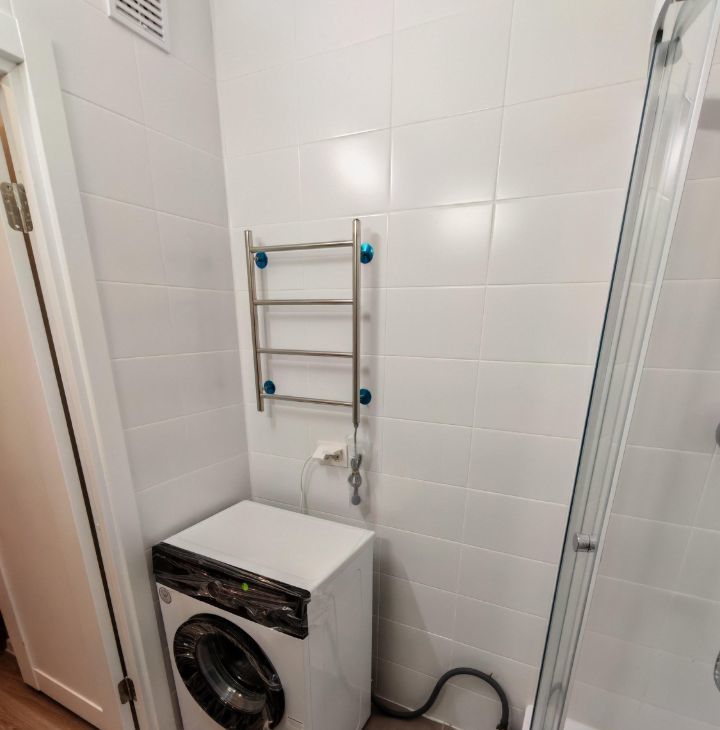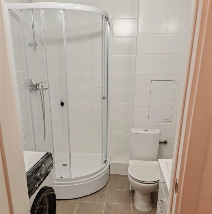 * удобная душевая кабина, унитаз, раковина с тумбой для хранения, полотенцесушитель;