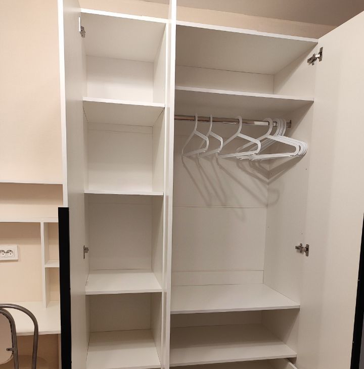 Современная мебель: 1 вместительный шкаф, комод 140 см с выдвижными ящиками для хранения, удобный письменный стол для дистанционной работы, стеллаж удобно разделяет кухонную зону и зону отдыха. Над комодом возможно повесить экран для проектора 150*150. Студия имеет видовые характеристики.