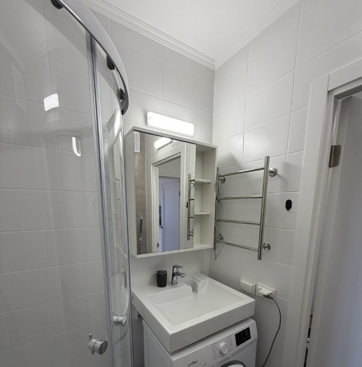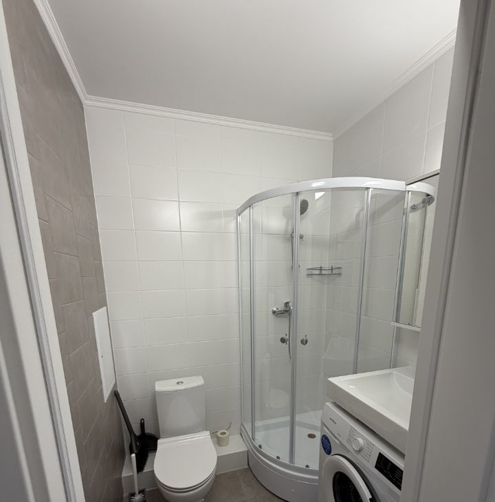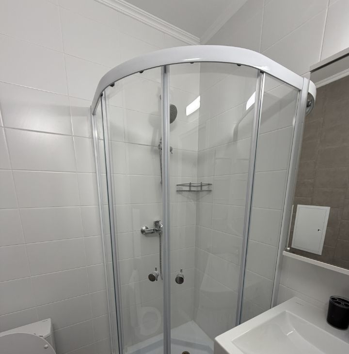 • Санузел с новой сантехникой: душевая кабина/ раковина, унитаз — всё с завода