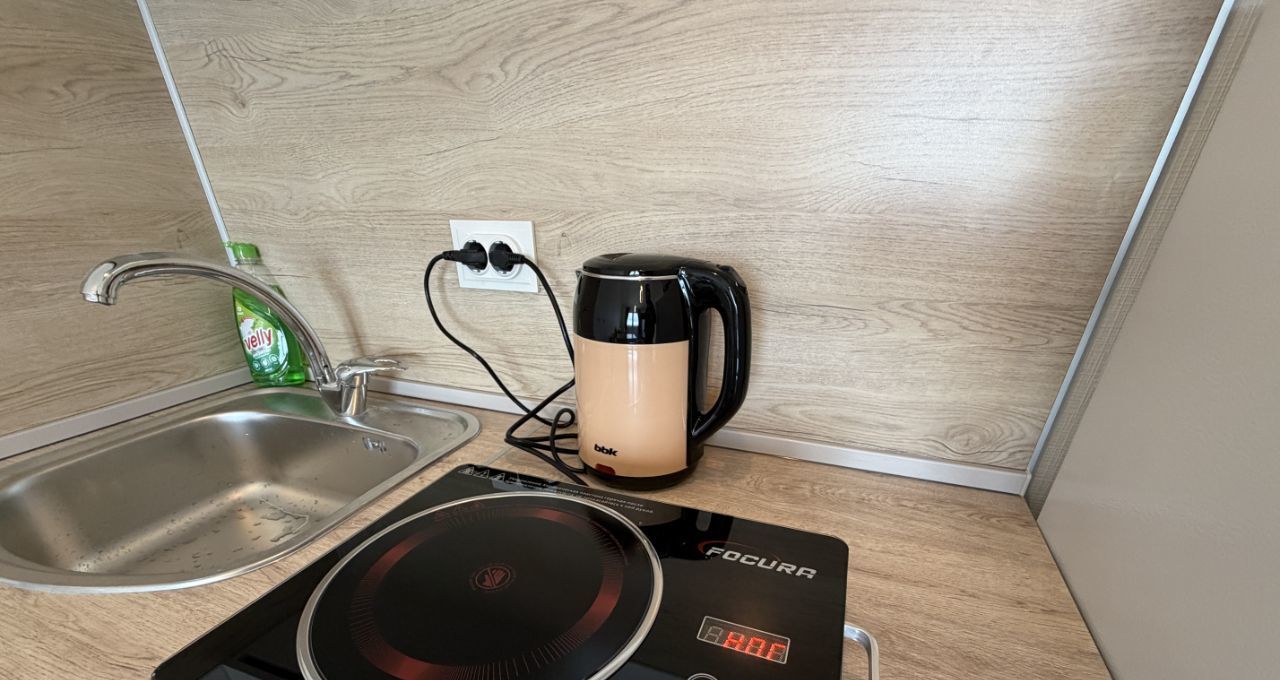 • Кухонная зона: новый гарнитур, варочная плита, вытяжка, холодильник, чайник