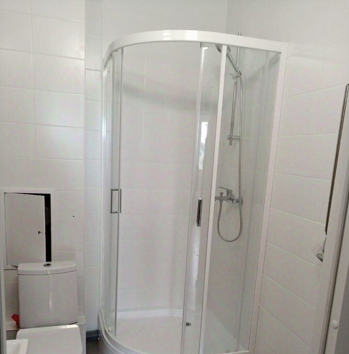 Совмещенный санузел оснащен душевой кабиной, раковиной с системой хранения, унитазом и электрическим полотенцесушителем. Так же, в санузле есть место, подведение и отведение воды для стиральной машинки.