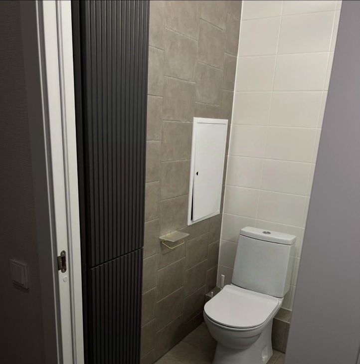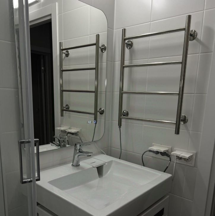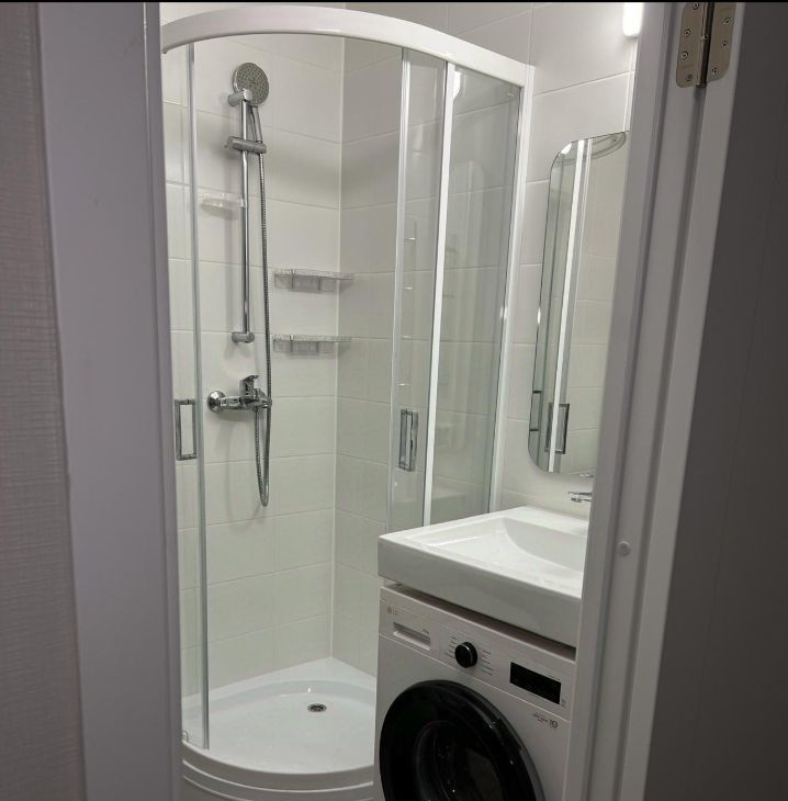 - Ванная комната: зеркало с подсветкой + указанием времени и температуры, душевая кабина, туалет, шкаф с рефленым фасадом для хранения. Стиральная машина, встроенная под раковину, очень стильная большая раковина.