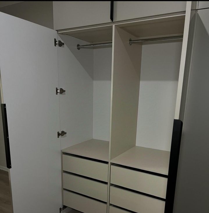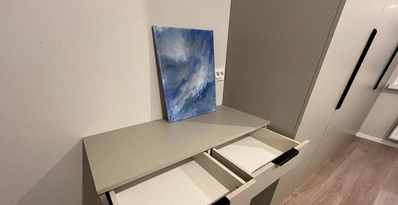 - Основная комната: раскладывающийся диван (антикоготь), огромный шкаф, в который поместится все, туалетный столик с двумя ящиками.
