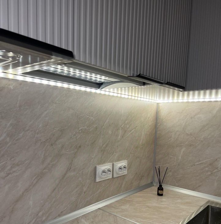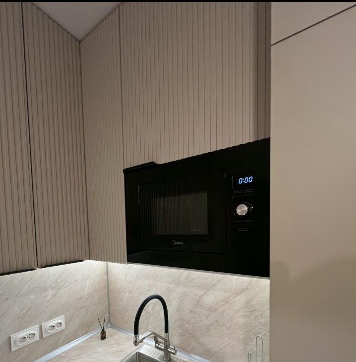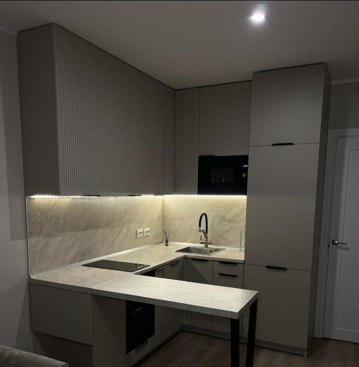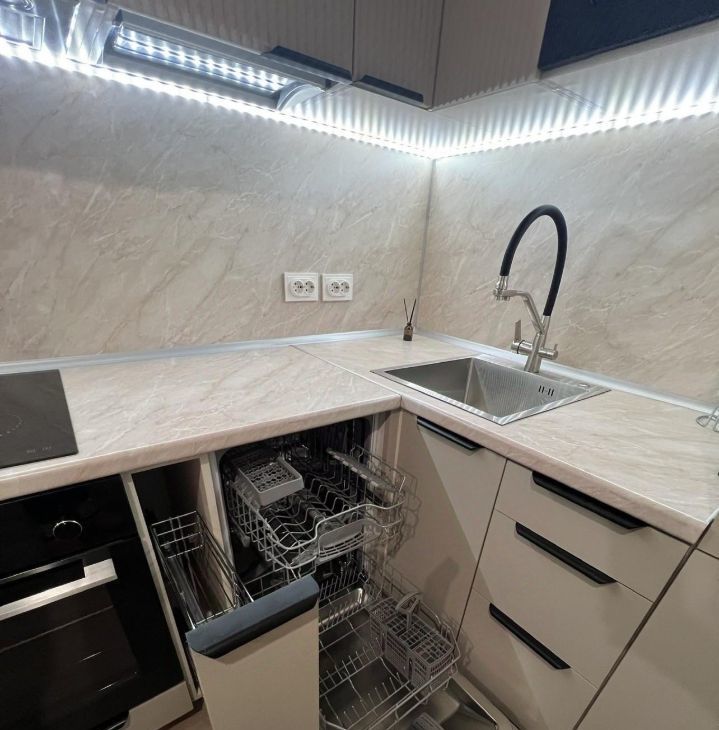 - Кухня: приятный рефленый фасад, который смотрится невероятно стильно, очень хороший встраиваемый холодильник с морозильной камерой, встраиваемая микроволновка, духовой шкаф и варочная поверхность, посудомоечная машина Bosh, барная стойка (стулья докупим под новых хозяев), вытяжка, подсветка, огромное количество мест для хранения, классный гибкий смеситель, СИСТЕМА ФИЛЬТРАЦИИ ВОДЫ - это позволит сэкономить на покупке чистой питьевой воды.