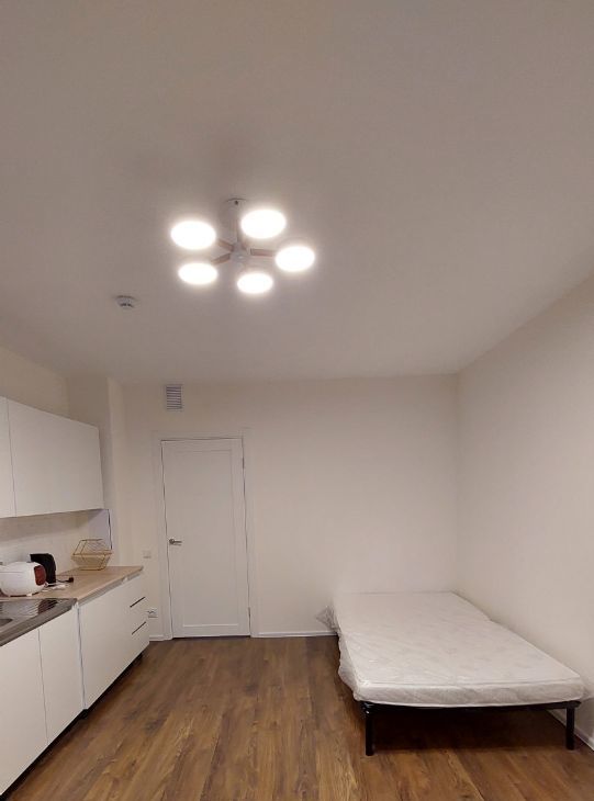 Квартира расположена на 12 этаже 24-этажного здания. Общая площадь составляет 23 кв.м, жилая площадь — 21.8 кв.м. Высота потолков — 2.4 метра. Из окон открывается вид на улицу. До метро "Девяткино" всего 12 минут на автомобиле, в пешей доступности жд станция "Ручьи". В одной минуты хотьбы школа и детский сад. Рядом с домом пятёрочка, аптека, озон, кофейни и другие магазины.