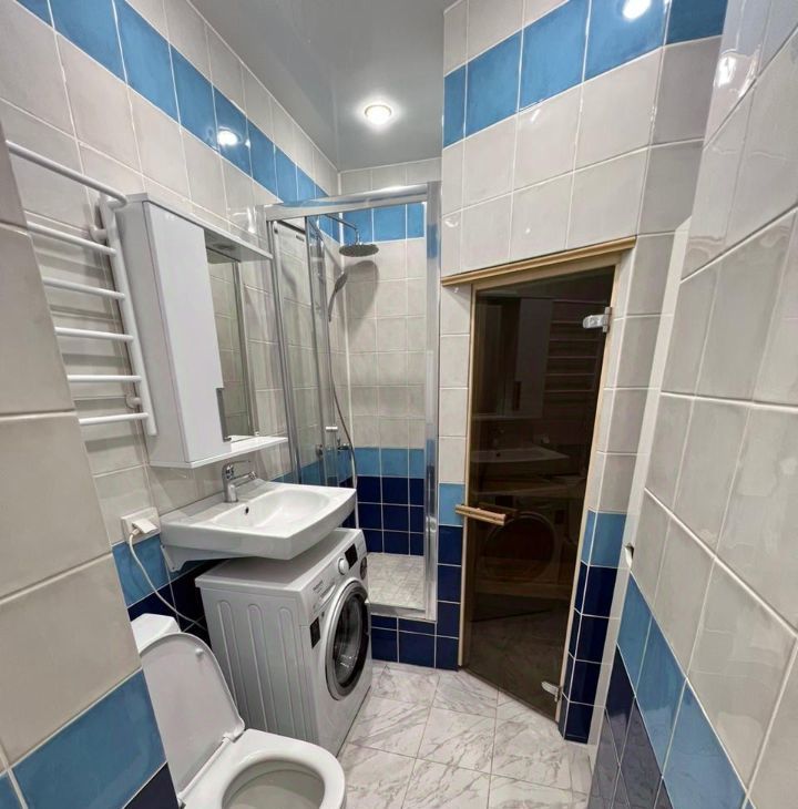 Санузел с душевой кабиной и всторенной мини-сауной, стиральная машина Hotpoint, теплый пол (также в коридоре).