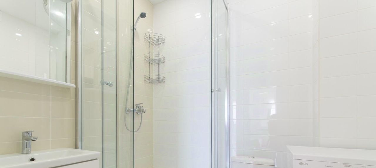 Ванная комната в кафеле, здесь нашлось место просторной душевой кабине, умывальнику с зеркалом и вместительной стиральной машине.