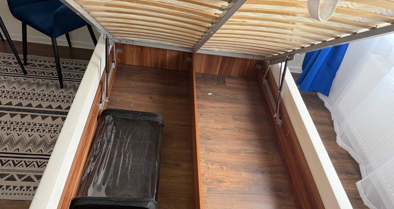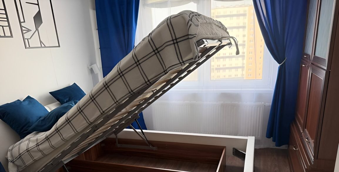 Большая двуспальная кровать с подъемным механизмом и ортопедическим матрасом. Новые спальные принадлежности (одеяло, подушки, плед, комплект постельного белья).