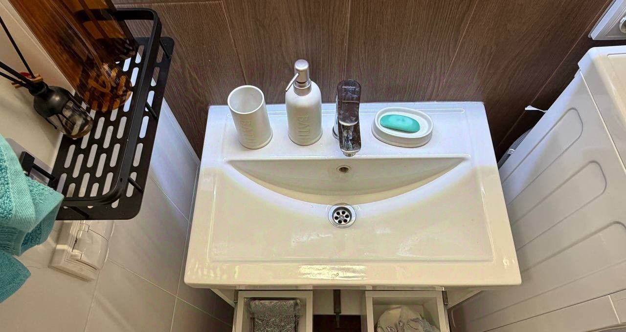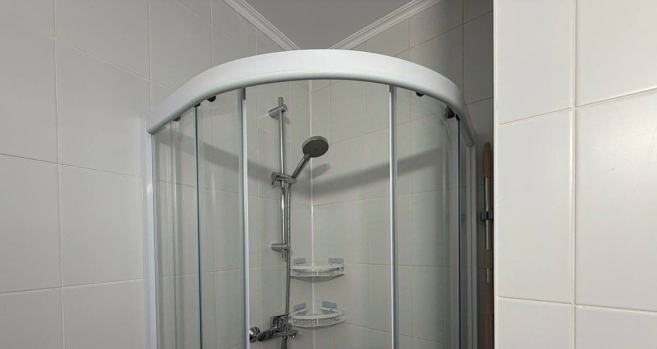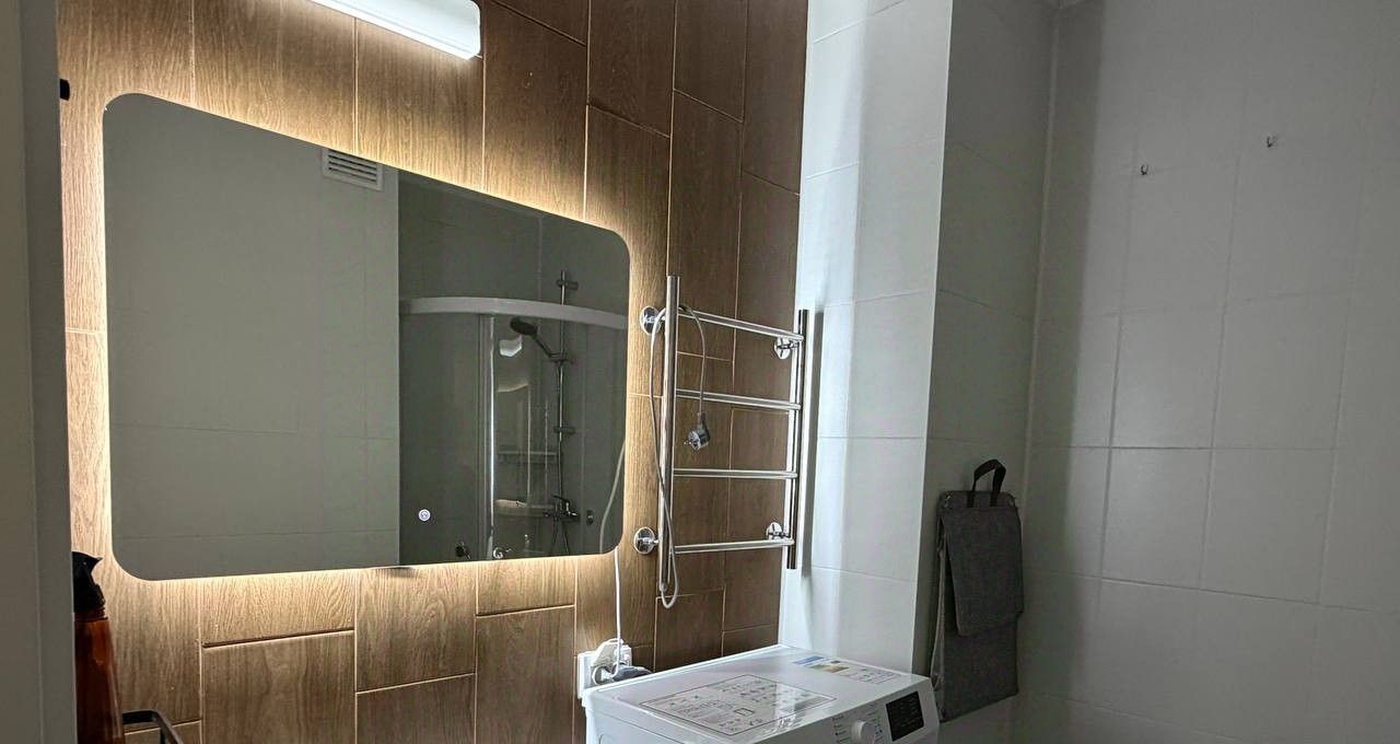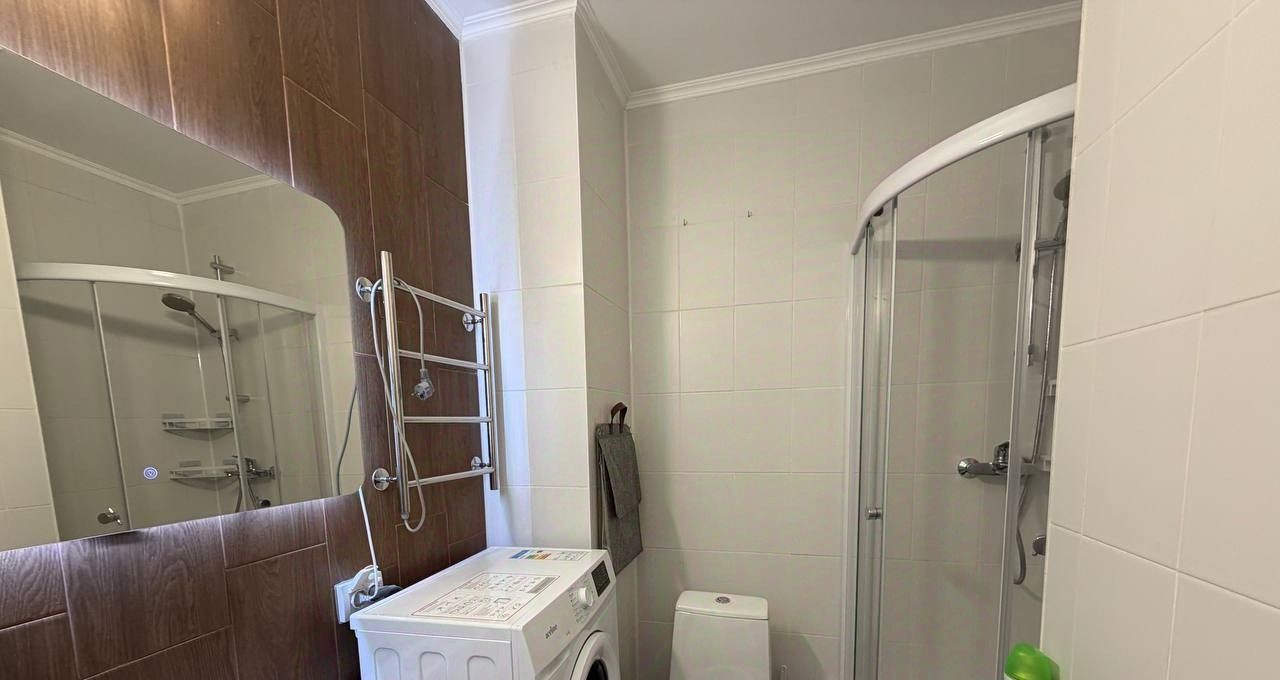 Санузел совмещенный, с установленной душевой кабиной, раковиной с ящиком для хранения принадлежностей, зеркало с подсветкой, стиральная машина.