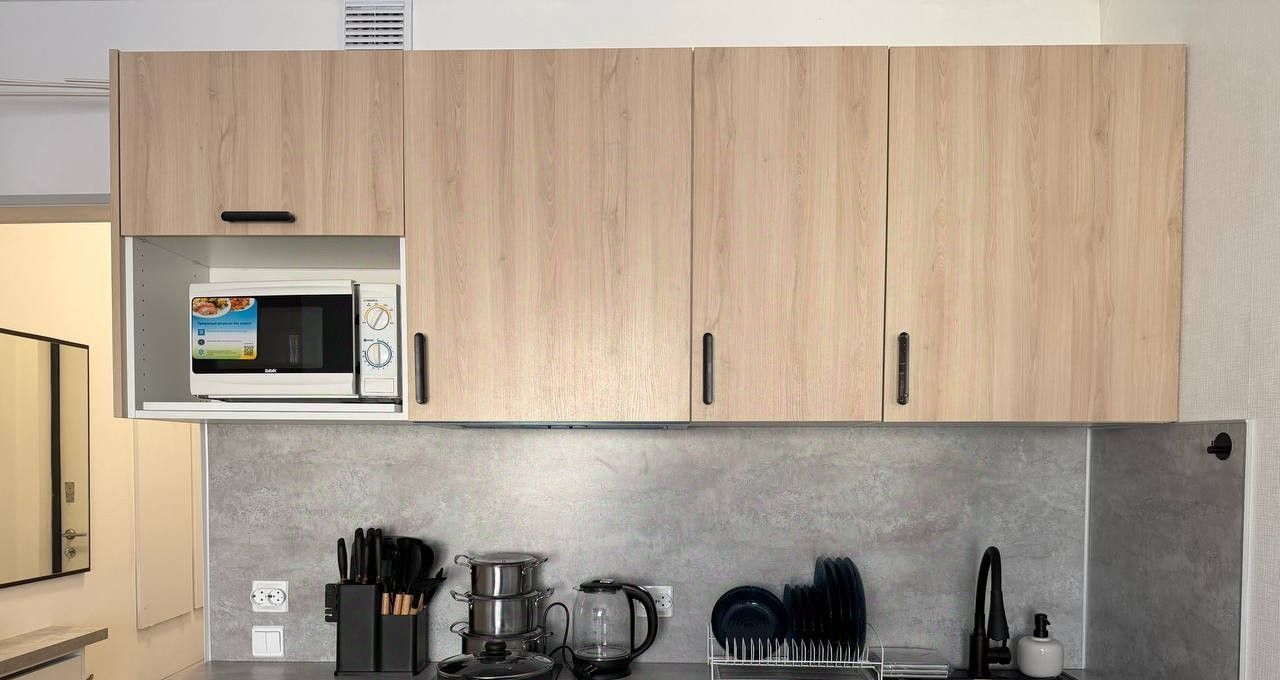 Кухонный гарнитур со встроенной техникой (варочная поверхность и духовой шкаф), холодильник, микроволновая печь. Для Вашего удобства в квартире уже есть электрический чайник, посуда для приготовления и приема пищи, столовые приборы.