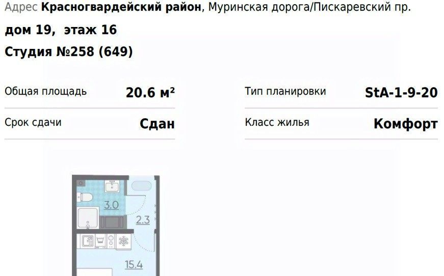 Студия Санкт-Петербург ул. Пейзажная, 30 (20.6 м²)