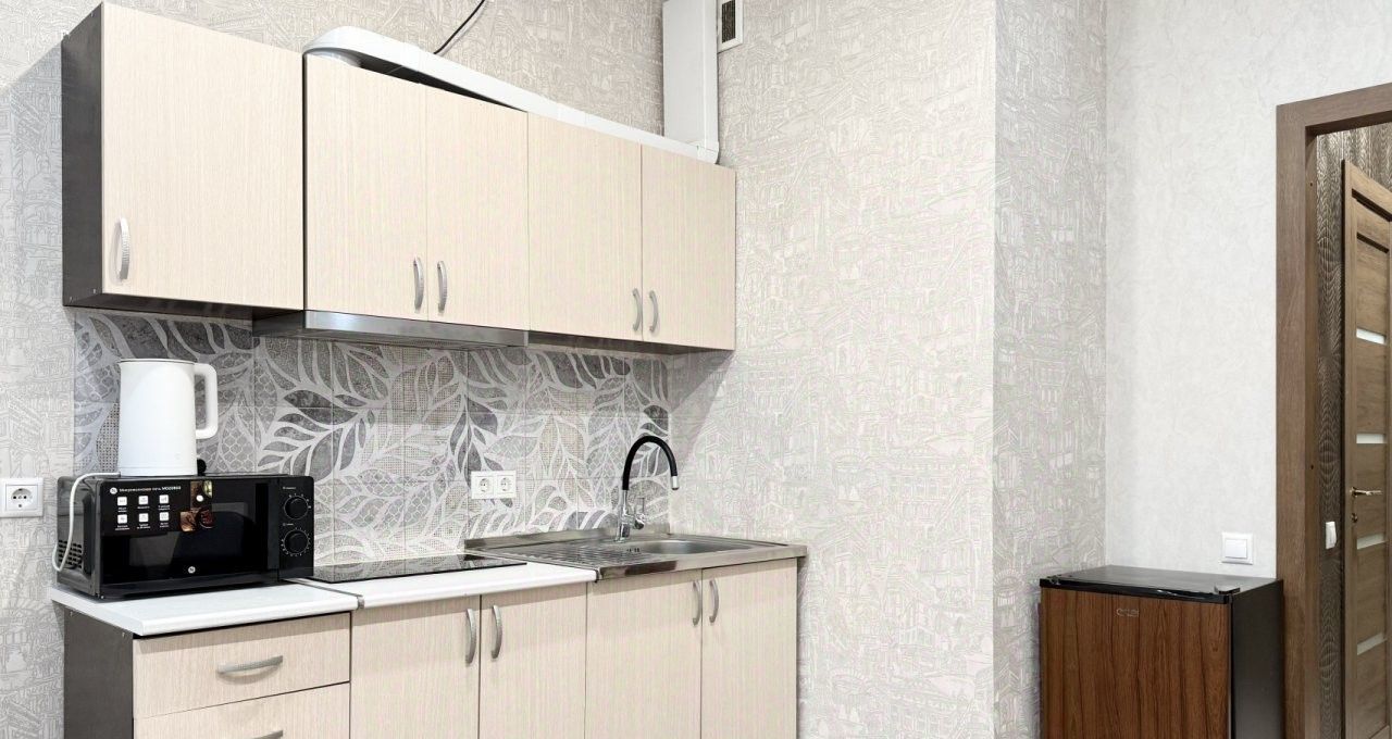 - полностью оборудованную кухню: варочная панель, холодильник, микроволновая печь, эл.чайник;