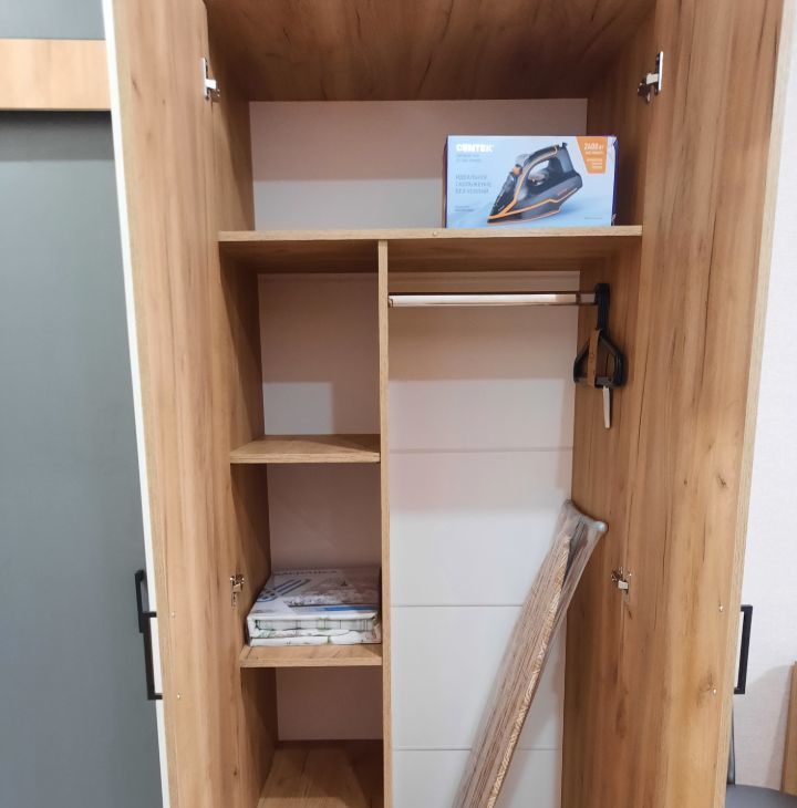 Есть посуда, чайник, утюг, гладильная доска, сушилка для белья, постельные принадлежности.