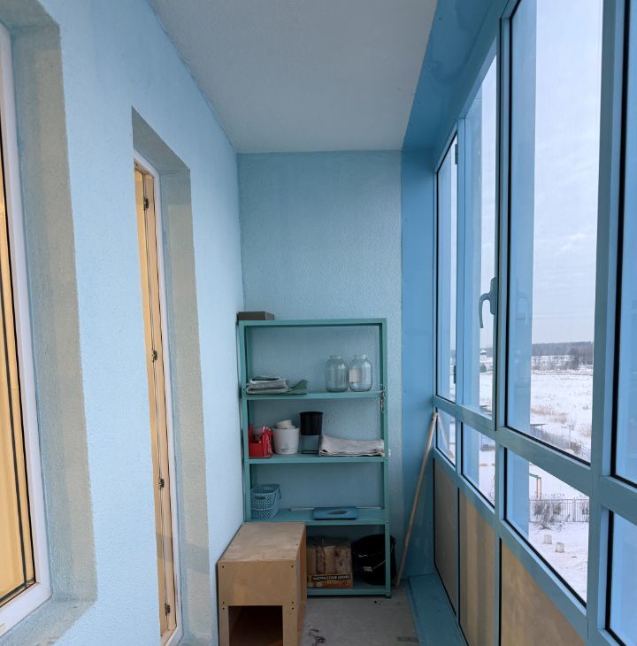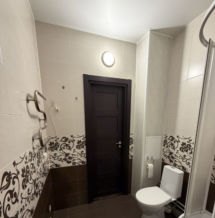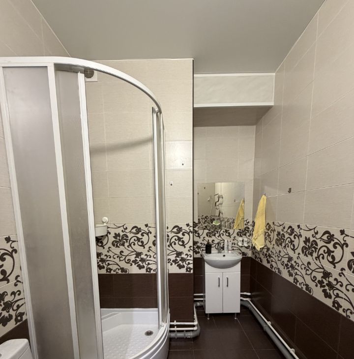 Кухня с чайником и бытовой техникой: варочная панель, духовка, холодильник; обеденная зона со столом и стульями. В коридоре вместительный шкаф и тумба для обуви. Санузел совмещенный - с душем. В ближайшее время будет приобретена стиральная машинка.