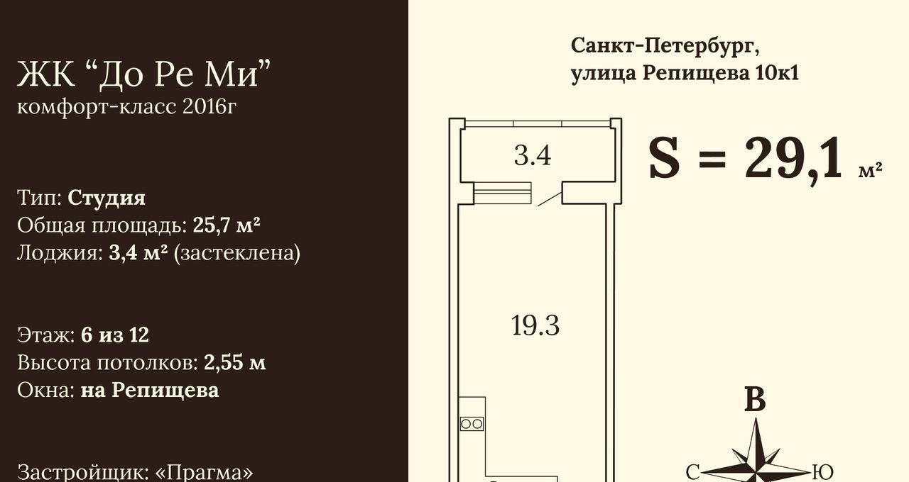 • Метраж: 29,1 м² (жилая зона 25,7 м² + застекленная лоджия 3,4 м²), комфортный 6-й этаж. Высота потолков — 2,55 м.