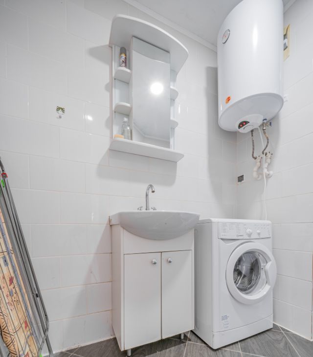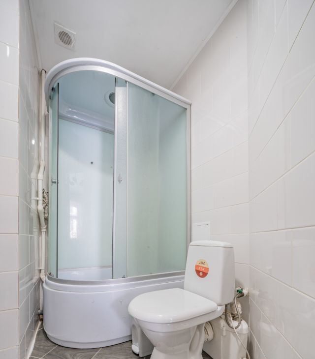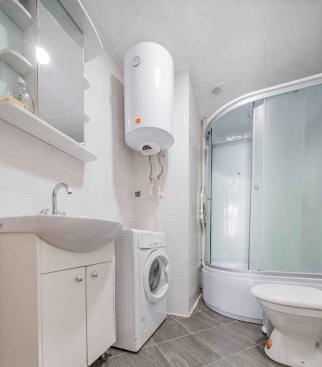 В студии раскладной диван, шкаф для ваших вещей и тумбочка. В санузле душевая кабина и стиральная машина. Высокие потолки, окна выходят на улицу (светлая сторона), на памятник Сергея Довлатова.